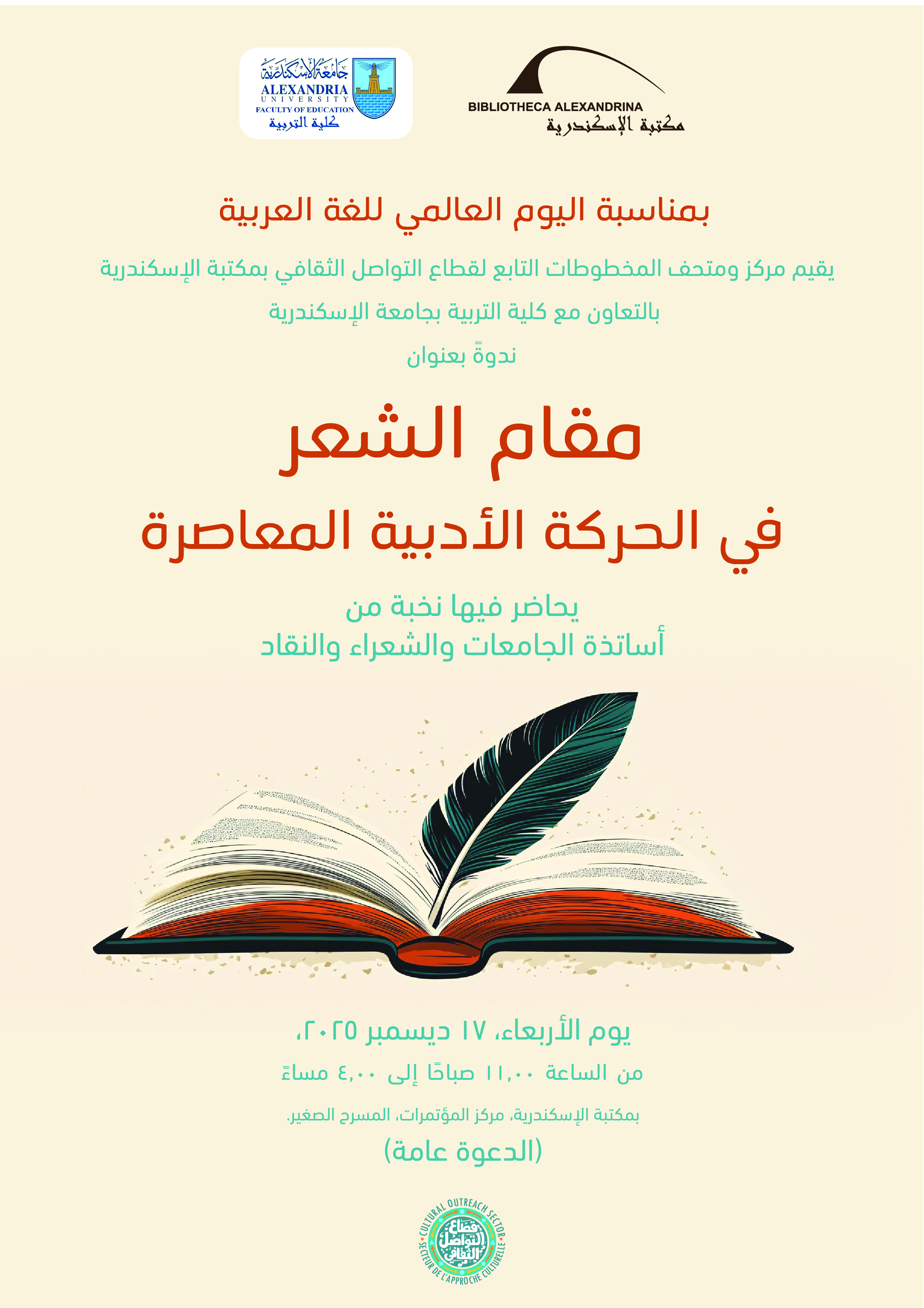 في إطار الاحتفال السنوي باليوم العالمي للغة العربية، يفتتح الأستاذ الدكتور أحمد زايد مدير مكتبة الإسكندرية ندوة تحت عنوان: "مقام الشعر في الحركة الأدبية المعاصرة"، والتي يعقدها مركز ومتحف المخطوطات التابع لقطاع التواصل الثقافي بالتعاون مع كلية التربية بجامعة الإسكندرية، ويحاضر فيها نخبة من أساتذة الجامعات والشعراء والنقاد، وذلك يوم الأربعاء الموافق 17 ديسمبر 2025، بالمسرح الصغير، بقاعة مؤتمرات المكتبة، من الحادية عشر صباحاً إلى الرابعة عصراً.