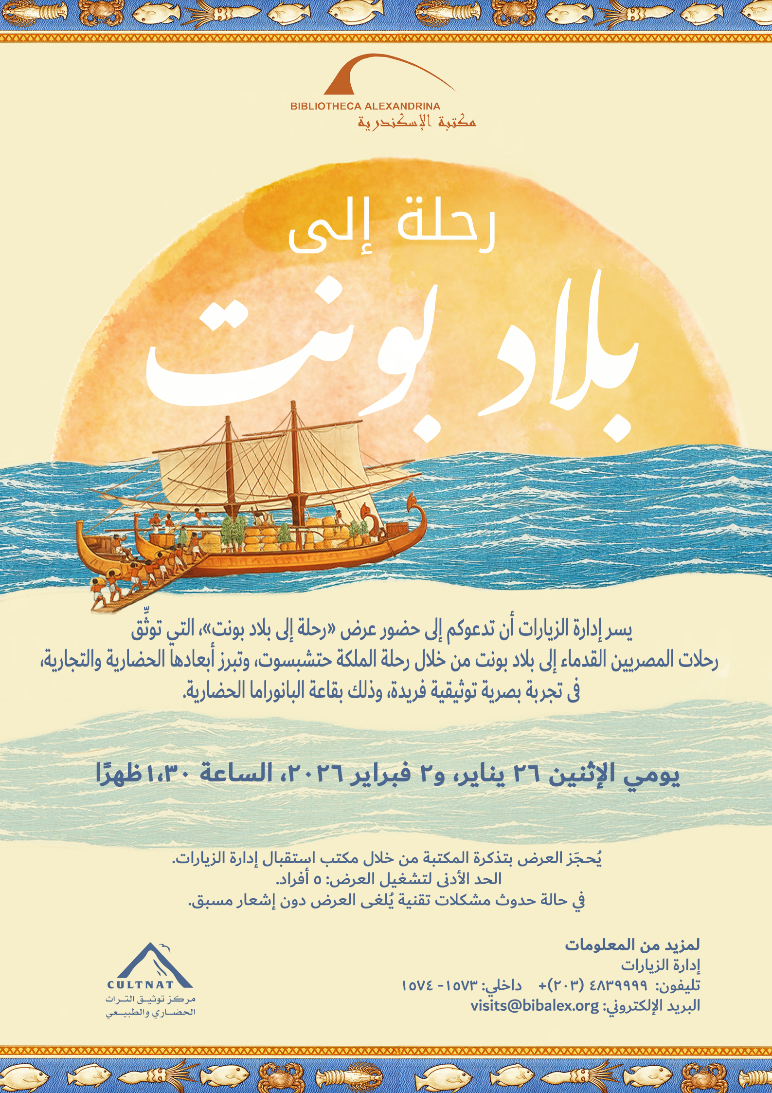 يسر إدارة الزيارات بقطاع العلاقات الخارجية والإعلام بمكتبة الإسكندرية، أن تعلن عن عرض «رحلة إلى بلاد بونت» بقاعة عرض البانوراما الحضارية.