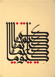وتضم الأعمال كذلك لوحات للشيخ محمود إبراهيم سلامة، شيخ الخطاطين المعاصرين، الذي تميزت أعماله بالمزج بين أصالة الخط التقليدي والابتكار الجمالي، مع توظيف زخرفي يخدم تكوين اللوحة ويعزز قيمتها البصرية.